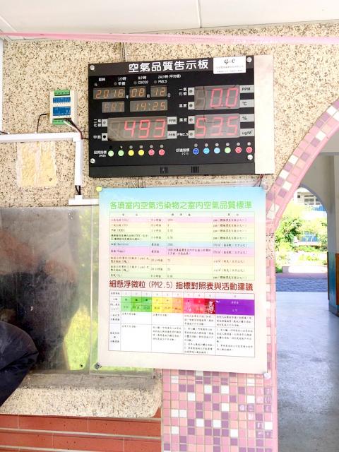 As air quality in Taiwan worsens, the concentration of PM2.5 — fine particulate matter measuring 25 micrometers in diameter or smaller – is often high and sometimes reaches hazardous levels, which poses health risks to students with allergies and asthma. Shipai Elementary School Principal Wu Sheng-hsueh says parents and teachers have often inquired about whether the air quality is good for having outdoor classes, but the school did not have the technology to determine that and the Central Weather Bureau Web site only provides broad-brush data on the air quality of the larger region.