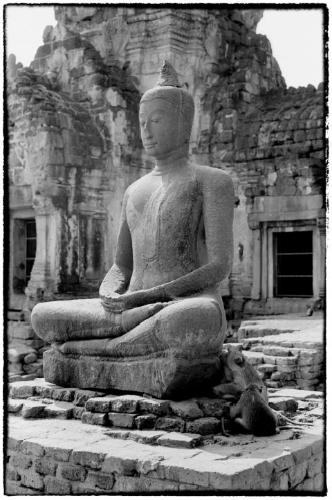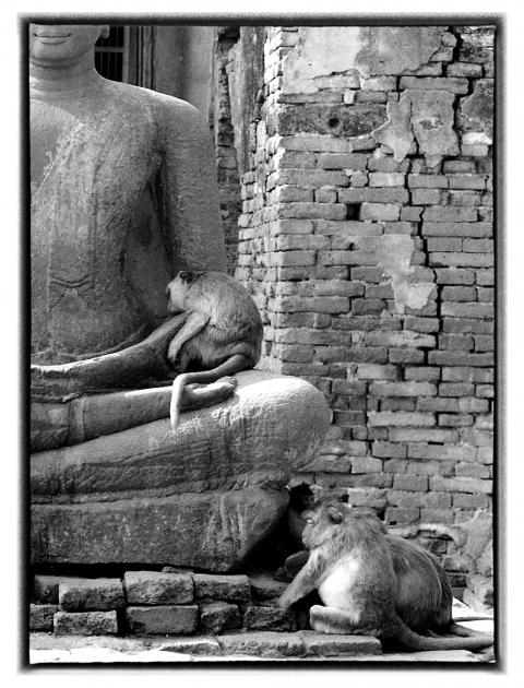 在華富里府的一座寺廟廢墟裡,有一群猴子坐在一具佛祖雕像的基座上,彷彿是來參拜的。在泰國境內仍有定居人口的城市中,華富里府是數一數二古老的。在西元六世紀,華富里府是阿育陀耶王朝的第二個首都。如今,華富里府又稱猴城,因為當地猴群相當猖獗。 (台北時報涂宇安譯)
