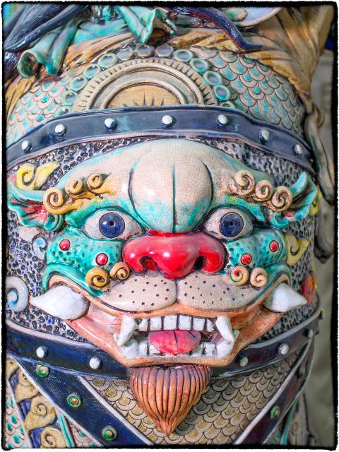 Koji pottery is a type of folk art commonly seen on traditional architecture, combining modeling, firing and painting, that originally developed in China’s Fujian province. Popular themes include auspicious wishes, legends and fables, folk tales and stories from history. The pottery is often used on temples or as decorative elements on traditional residences.