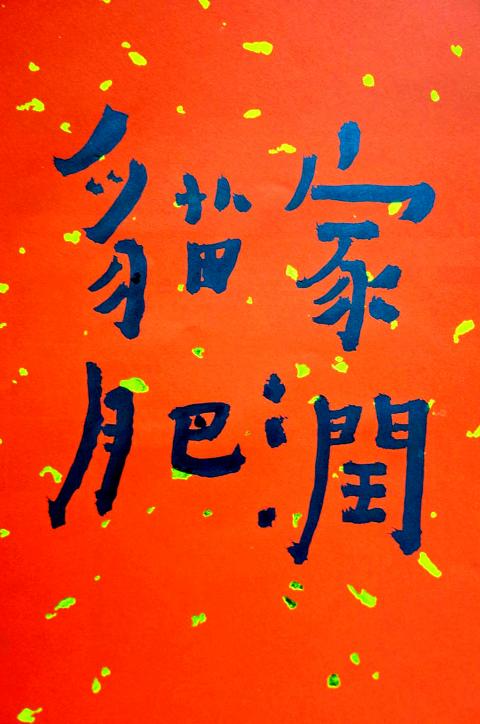 New year couplets can also be very modern. The progressive Taiwanese poet and calligrapher Ho Ching-chwang has penned the four-character couplets mao fei jia run (貓肥家潤) and gou gou wang jia (狗勾旺家), using gentle humor to link the health of animals — well-fed cats in the first, yapping puppies in the second — to health and prosperity at home, cleverly echoing liu chu xing wang. Ho’s lively yet elegant calligraphy imparts her couplets with a distinctly modern feel.