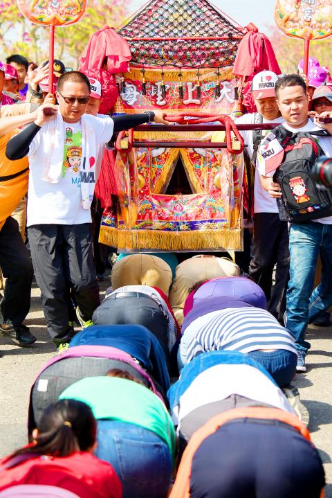 你也可以跑到媽祖鑾轎前面,加入一長列跪伏在地的信眾,一起「稜轎腳」,讓鑾轎從頭上經過,以祈求好運。不過,如果你要「稜轎腳」,記得一定要取下頭上的帽子。我忘了脫帽,結果立即有人戳了我的頭,並用頗為尖銳的聲音說:「把帽子脫掉,放尊重點!」