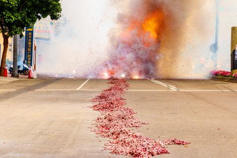 大量爆炸的鞭炮,或堆成半公尺高的小山,或沿路鋪開排成長長的火蛇,發出震耳欲聾的聲響,揚起的煙雲充斥著硝酸鉀和細懸浮微粒,滲透進你身體的每一個毛孔,讓你的鼻子和喉嚨都發疼。