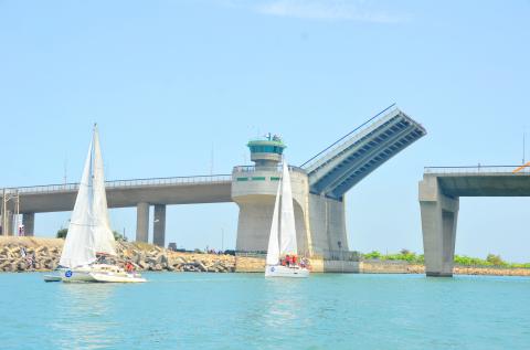 The boat will sail straight when it reaches the bridge.