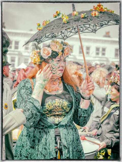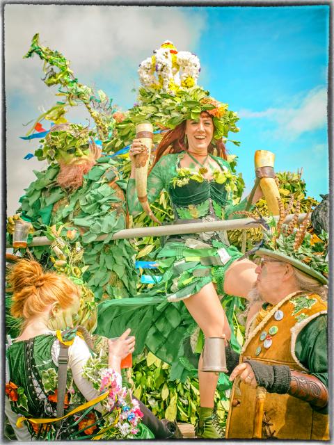 A three-meter-tall structure decorated with twigs, leaves and branches, a green mask and a regal crown wends its way through the streets of Hastings Old Town. Somewhere inside is a weary man or woman — they take turns over the course of the parade — laboring under the weight of the edifice mounted on their shoulders. This is the “Jack-in-the-Green,” and it is followed by a retinue of revelers in pagan garb, sometimes jovial, often outlandish, predominantly green, always related in some way to Nature and the coming of the summer.