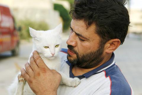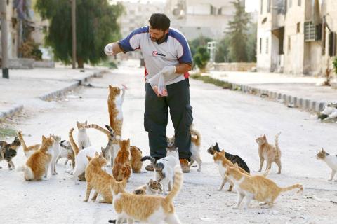 敘利亞大城阿勒坡屢遭戰火摧殘,一名救護車司機及護理人員艾力賈里,從二○一三年開始,就在阿勒坡東部照料無家可歸的流浪動物,持續至今餵養過無數貓咪,因此他被譽為「阿勒坡貓男」,在戰爭和破壞中展現出人類的韌性和善良。
