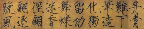 Slender gold script is essentially a form of kaishu standard script, placing extra emphasis on where the brush rests and changes direction, using slender, vigorous brush strokes. Large characters of slender gold script were difficult to write, and each character in this poem is over 10 cm tall. The forceful brushstrokes almost appear to have been carved out with a knife. The script, with its large, vigorous and elegant strokes, convey the fearless spirit one would expect of an emperor.