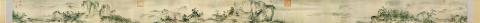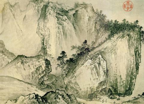 The precipice shown in this central section of Pure and Remote View of Streams and Mountains by the Song Dynasty painter Xia Gui (active approx. 1200~1230 AD) is painted using the fupicun — axe-cut texture stroke — technique to create a layering effect and to differentiate rocks, while also giving them the impression of substance and weight. The artist would draw in the outlines of the precipice with a brush liberally loaded with ink, using it to differentiate the different layers of rock, and then paint on the finer lines on the rock surface using a lighter tone of ink and employing the zhongfeng — perpendicular to the paper, using the the brush along its central axis — method. Finally, he would have etched on the surface texture of the rock, with protrusions and crevasses, in the axe-cut texture stroke using the cunfa technique.