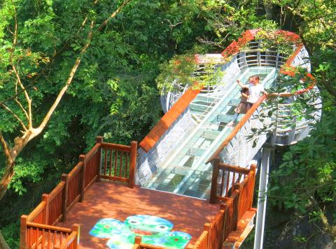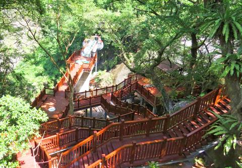 Jianshih Township Mayor Yun Tien-pao says he secured approximately NT$30 million of funding from central government to build the new trail, most of which uses a wooden boardwalk design. The walk is divided into two main sections: a waterfall-viewing trail and an ecological trail. The bulbous viewing platform at the end of the waterfall-viewing walk, which is shaped like a three-leaf clover and uses a suspended steel girder and glass design, takes its inspiration from viewing areas at popular scenic spots in other parts of the country. When standing on the platform, visitors will be able to look up in the direction of Frog Rock and take in the spectacular iridescent waterfall, while looking down through the clear glass they will get a clear view of the valley below.