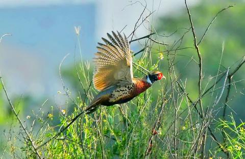 The Formosan ring-necked pheasant, Taiwan blue pheasant and mikado pheasant are the three main types of protected pheasant in Taiwan. The “wailing chicken,” or Formosan ring-necked pheasant, mostly perches in flat open fields and used to be a common sight in Taiwan. However, a combination of excessive hunting and overdevelopment has meant that these days it is rare to catch a glimpse of the bird. Huang says that Formosan ring-necked pheasants will immediately take off if they catch sight of a human or hear the wind rustling through the grass, which makes watching them extremely difficult.