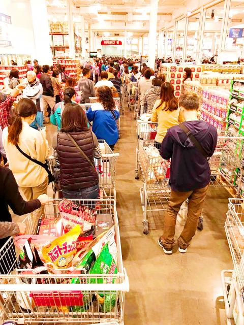 At a Costco outlet in Taipei’s Neihu District, members of the public lined up outside from 3am in the morning. By 8am numbers had already swelled to almost 100 shoppers waiting in line to get inside and by about 8:30am large crowds had descended on the store.