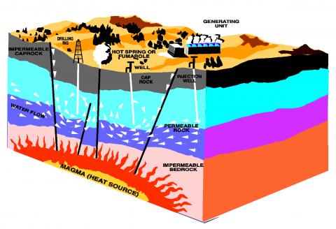 地熱發電的原理為利用取之不盡的地熱來加熱地下水,使其成為蒸汽來推動渦輪機旋轉發電。