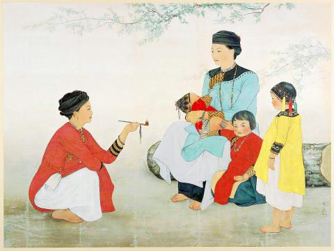 Rendered in Chen’s brushwork style — Chen is known for her Japanese-style Nihonga gouache paintings — the woman cradling a baby, the little girls dressed in red and yellow, and the woman squatting and holding a pipe to the left of the composition, are all natural and elegantly poised. With the various scarves, clothes and jewelry denoting different social status, the meticulous rendering and rich colors of the work have distinctly ethnic features.