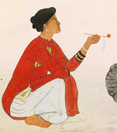 Interestingly, when one compares the earlier drafts with the final exhibited work, the figures in the draft feature beady eyes and rather haughty postures, as well as darker skin color (photos 2 and 3). Of course, the grand scale, attention to detail and high degree of completeness of the exhibited piece make it the more “beautiful” version, but one cannot help feel that something of the edge of the figures as originally captured by the artist has been smoothed away, such that they appear more like the non-Aboriginal inhabitants of Taiwan at the time, albeit in Aboriginal clothes, while the woman smoking holds her pipe in a way one might associate more with a French woman. These changes were perhaps made to more suit the aesthetic preferences of the Japanese exhibition judges, both in terms of the depiction of the female and of other ethnicities, so that they were exotic without appearing threatening.