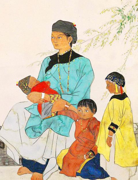 在膠彩人物畫名家陳進筆下,抱著嬰孩的女子、紅衣和黃衣小女孩、蹲在左方手持煙斗的女人,有著自然優雅的神態;表示不同身份地位的頭巾、衣服、珠鏈,其精緻的圖樣和豐富的色彩極具民族特色。