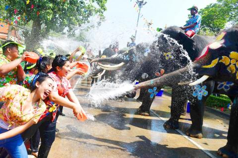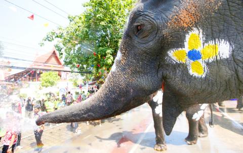週三在慶祝泰王國傳統新年的一場街頭對戰中,大象用牠們的象鼻子把水噴灑在穿著花衣裳的泰國人群身上。喧鬧的泰國傳統新年節慶又稱「宋干節」,本週將會吸引狂歡的人群一起出外參加全國遍地開花的打水仗活動。