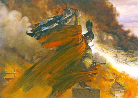 Chen was commissioned to illustrate over 200 characters for the Japanese computer game producer GameArts’ 2001 historical strategy game Chen Uen no San Goku Shi (Chen Uen’s Romance of the Three Kingdoms). Luoyang in Flames (photo 2) depicts the scene of Dong Zhuo setting fire to the city of Luoyang, grasping a young Emperor Xian of the Han Dynasty in his hand. The city of Luoyang in the background, engulfed in flames and black smoke, were unmistakably Chen’s work, something no other artist could have achieved, using the command over perspective and architectural drawing that he had perfected in the interior design studio he had established.