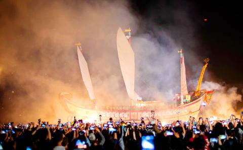 The boat was taken out of Donglong Temple around 2am, moved to the nearby Jhen Hai beach and set alight at just after 5am. At 6:40am, with the sun in the sky and the crowds mostly gone, the main mast of the burning boat collapsed, its fall cushioned by the boat’s smoldering ashes.