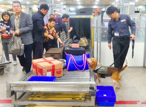 There are currently 47 sniffer dogs in Taiwan, including 29 beagles, 10 Labradors and eight mixed-breed dogs, which carry out their duties at airports, sea ports and international parcel centers all over the country. Taoyuan International Airport has the most sniffer dogs — 25 in all. Even the Shuitou Pier in Kinmen County, a port for the “small three links” with China, has three sniffer dogs.