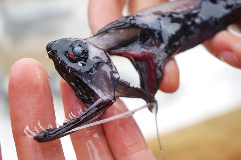 It has a black, elongated, eel-like body, with a long, fleshy filament called a barbel hanging from its lower jaw with a bioluminescent organ called a photophore on the end to lure prey. It also has two rows of photophores along the length of its body. Its long, sharp teeth are big relative to its body size. Its face looks like the creatures from the “Alien” movies, and it has a similarly vicious disposition.
