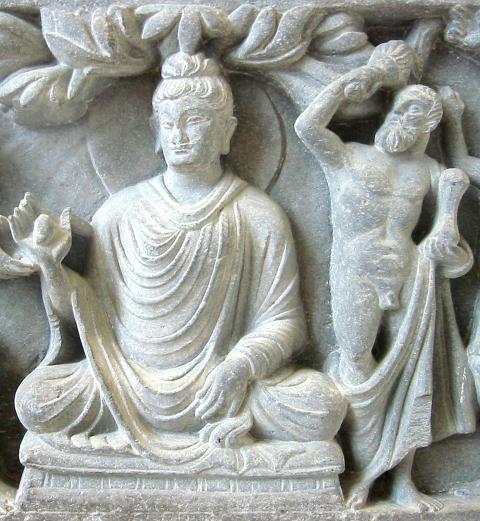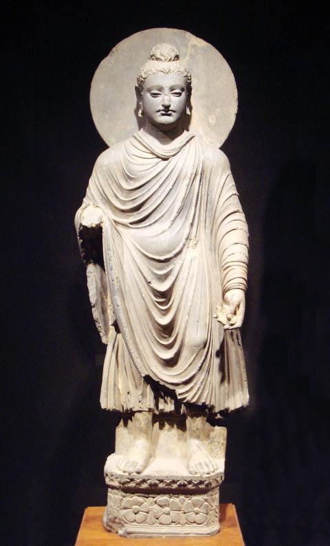 佛教傳到印度-希臘王國後,大約在西元前二世紀至西元一世紀之間,開始出現了佛陀的造像——身著希臘式衣袍——要不是因為有髮髻、垂肩大耳等代表佛陀的特徵,其衣著姿態看起來就像是希臘雕塑。【圖一】