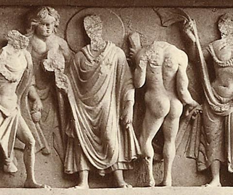 希臘工藝舉世無雙的寫實技術,應用在佛陀的形象化,想來理所當然。於是,呈現佛陀與護法菩薩的方式,便像是希臘神話中的諸神,將神與人的形象合一。【圖二、圖三】