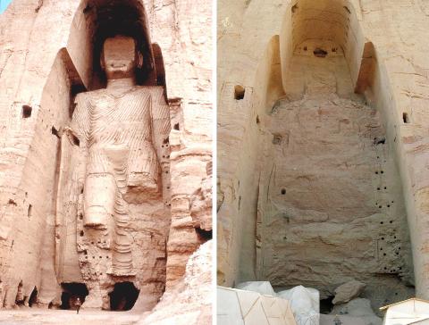 阿富汗的巴米揚谷,有兩尊大佛沿著山崖鑿出,分別高五十三公尺及三十五公尺,建於西元六世紀,是犍陀羅式佛像的代表,也是世界上最高的站立佛像,被聯合國教科文組織登錄為世界文化遺產。然而,巴米揚大佛已在二○○一年被塔利班政權炸毀,完全消失。【圖四】