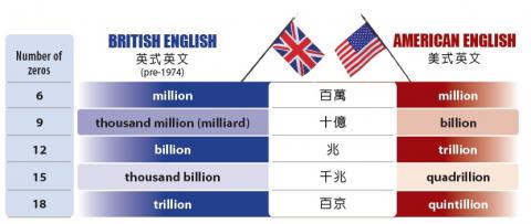 在這全球化的世界中,你會認為對大的數目有個統一的名稱是很基本的事。但「billion」一字卻非如此。在過去,英式英文裡的「billion」意為「一兆」(十的十二次方,或一百萬個一百萬);而在美式英文中,從以前到現在「billion」都是指「十億」(一千個百萬)。也就是說,英式「billion」比美式「billion」要多一千倍,這數字相當於美式英文的「trillion」一字。之所以如此,都要怪法國人。