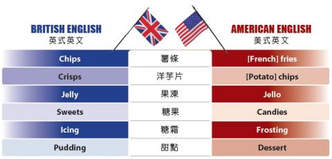 英、美式英文中食物的不同說法還有:美式英文的「cookies」(餅乾),指的是鬆脆的烘焙點心,在英式英文中通常稱為「biscuits」(餅乾);而美國的「biscuits」,則是外表硬、內部軟而易成碎屑的「quick bread」(速發麵包)。美國的「candies」(糖果)在英式英文叫做「sweets」;美國的「cotton candy」(棉花糖)是英國的「candy floss」;美國叫「cupcakes」(杯子蛋糕)的,在英國叫「fairy cakes」;美國的「frosting」(糖霜)是英國的「icing」;美國的「popicles」(冰棒)即為英國「ice lollies」;美國的「jello」(果凍)則是英國的「jelly」。
