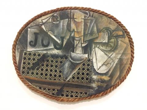 《有藤椅的靜物》(一九一二年)【圖一】,是畢卡索第一件拼貼作品。在橢圓形畫面的左下方,他貼了一塊印有藤椅紋路的油布,取代了對藤椅的描繪(即便是立體派式「支離破碎」的呈現方式)。這種對現實的直接「引用」,代替了手工繪製,使得對「大師手筆」的崇拜無以為繼,也混淆了大量製造的大眾物品與高級藝術間的界線。