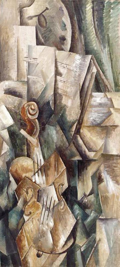 How the early Cubists broke down reality can be seen in Braque’s Violin and Palette (1909, photo 2). The violin, sheet music, and other shapes were “crushed” and then put back together like a mosaic.