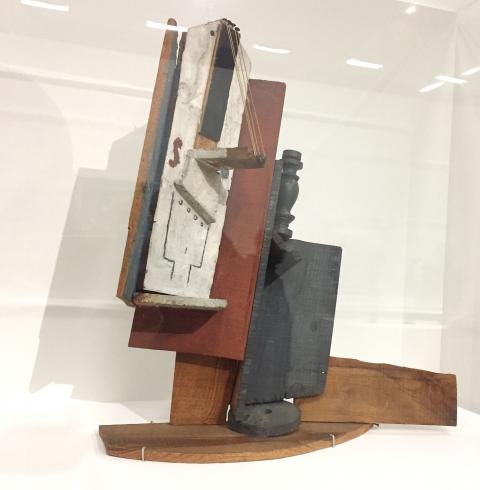 Picasso’s Violin and Bottle on a Table (1915, photo 4) is just like a 3D version of Braque’s Guitar (Scouts), echoing the pair’s close artistic relation, and demonstrating the application of Cubist principles to sculpture.