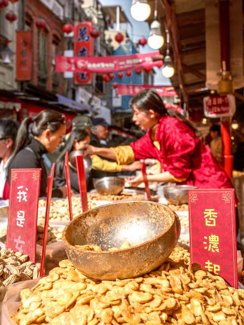 商店林立的年貨大街擠滿趕辦年貨的人,店鋪前擺出的攤子滿是蜜餞、糖果、薑茶和肉乾等年貨。