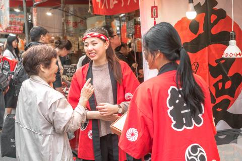 每攤的售貨員都穿著自家店統一的春節外套及上衣,喜氣洋洋,發試吃品和收錢的時候,都跟顧客有說有笑。