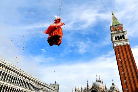 數千人上週日湧入聖馬可廣場──其中許多人是一身傳統化妝舞會的行頭──來見證「飛翔的天使」,為一年一度的威尼斯狂歡節揭開序幕。