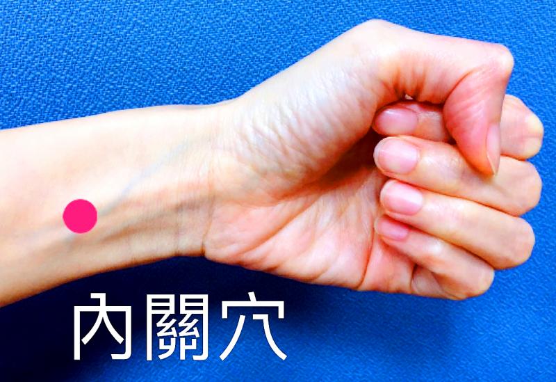 (二)內關穴:由掌面的腕橫紋中間向肘方向延伸三橫指長度,在兩筋之間的凹陷處便是內關。