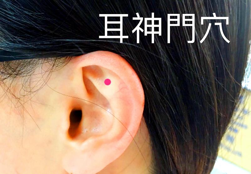 (三)3.耳神門穴:耳上第一凹窩上緣,外三分之一處就是耳神門穴。