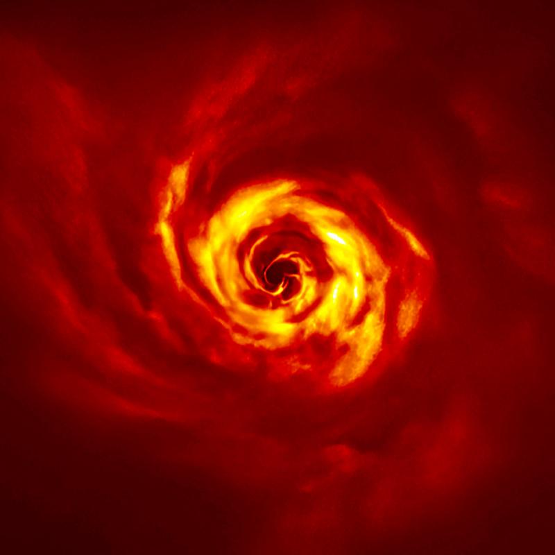 As the new planet rotates around AB Aurigae, it causes the surrounding gas and dust to be shaped into a spiral arm. The very bright yellow region near the center of the spiral is the twist, which lies at about the same distance from the star as Neptune from the sun.