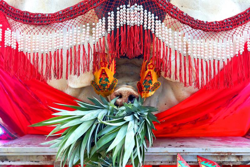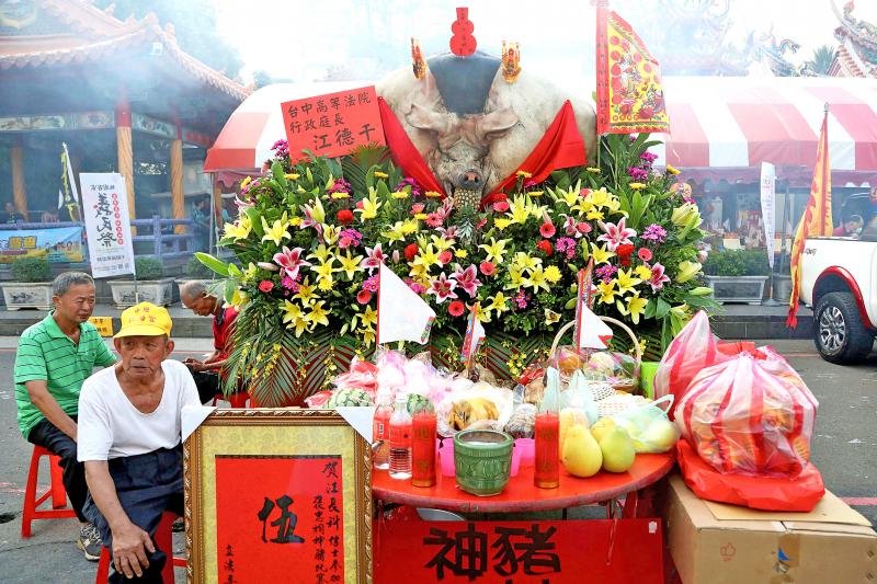 According to Council of Agriculture statistics from last year, there were only seven breeders of divine pigs still operating in Taiwan, with the number of pigs being raised having fallen to just 34. However, research has found that, last year, at the Hsinchu County Yimin Festival alone, 31 divine pigs were entered into the competition, 20 of which weighed in at over 600kg. Also, 35 temples throughout Taiwan held these fattened pig contests, accounting for at least 270 animals.