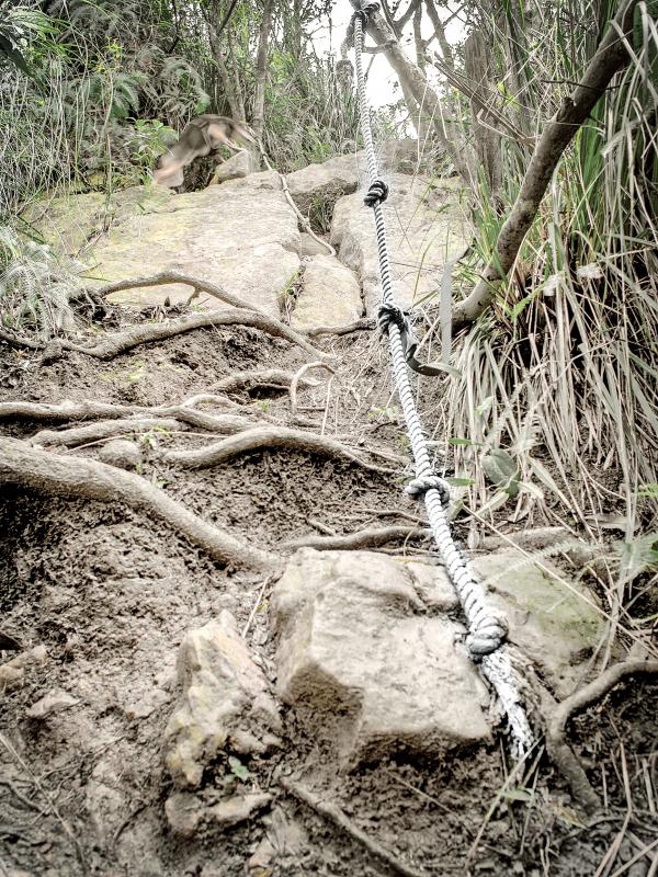 B: 沒錯。幸好有人把打結的繩子綁在上面,可是我還是覺得爬上那塊岩石很難。