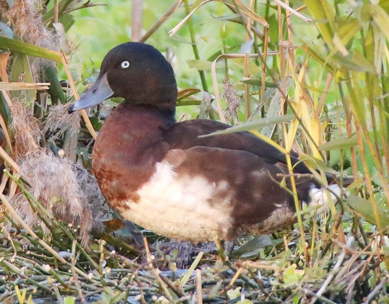 Lin said that when Baer’s pochards are not wearing their breeding plumage, they are very hard to distinguish from ferruginous ducks, due to their very similarly colored feathers, so many people confuse them. On this occasion, however, the close range made it possible to confirm that this was indeed a Baer’s pochard. During five hours of observation, Lin only saw the duck dive one or two times. It spent most of the time hidden away and sleeping among tall grass and weeds. It did its foraging around patches of water lettuce, rather than diving for food like the commonly seen tufted duck.