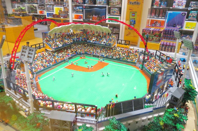 此外,他另組設台中洲際棒球場,為呈現球場的爆滿運動人氣,更利用逾兩千個樂高造型小人偶打造,看台上湧入滿場的熱情球迷,加上計分板是用積木顆粒拼裝,特色積木造景也很吸睛。