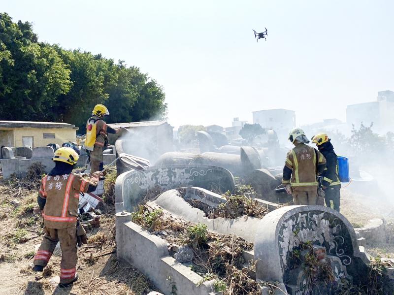 The four-day Tomb Sweeping Day long weekend is over. According to the Tainan City Government Fire Bureau, there were 143 fires in cemeteries and wooded areas during the same period around Tomb Sweeping Day last year. To reduce the occurrence of cemetery fires and save firefighters from getting exhausted as they rush around putting out fires, the Fire Bureau, as well as advising the public how to prevent fires, has also developed several effective tools for preventing and fighting fires in cemeteries, including drone broadcasts, leaf-blower fire extinguishers and fire-extinguishing brooms, which were all developed inexpensively. The Fire Bureau says that these firefighting tools and strategies proved effective during this year’s Tomb Sweeping Day long weekend, during which cemetery, wood and scrub fires have been reduced to 104 incidents.