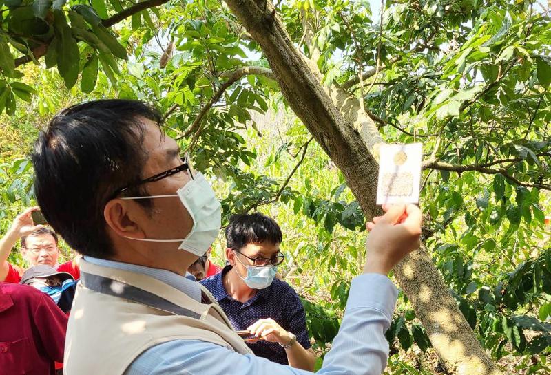Dongshan District has 205 hectares planted with litchi trees and 1,387 hectares planted with longan trees — the largest area in Tainan. The Dongshan District Farmers’ Association applied for subsidies for biological control of litchi stink bugs on 10 hectares of land. In the afternoon of April 17, Tainan Mayor Huang Wei-che went to the Dung Shang Mau Coffee Park in Dongshan District’s Nanshih Borough to inspect local industries and hang some Anastatus fulloi wasp egg cards on litchi trees.