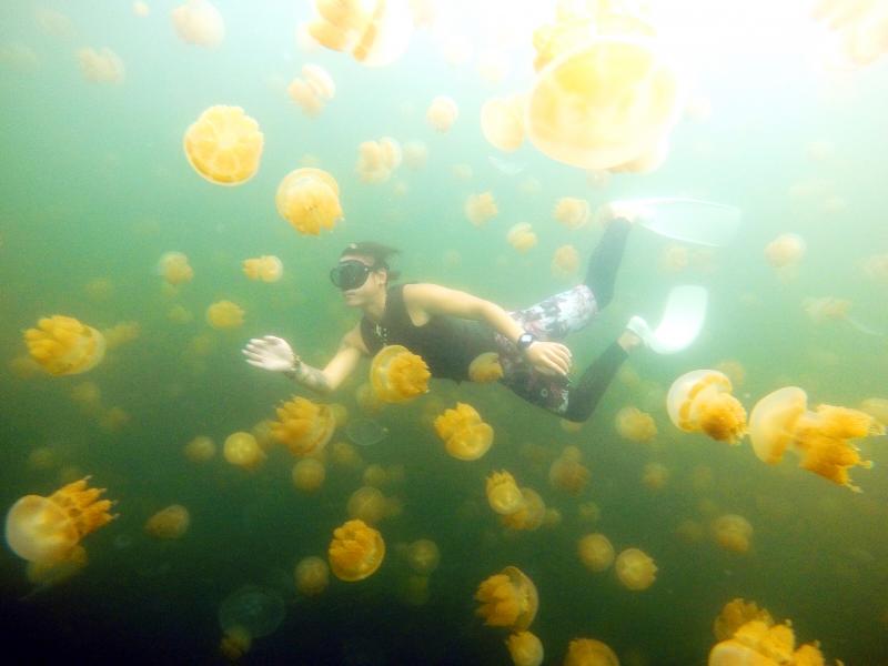 The most amazing part of the trip was without a doubt Jellyfish Lake. According to locals, there are apparently five or six jellyfish lakes in Palau, but in order to maintain a balanced ecology and sustainable tourism, only one is open to tourists. Jellyfish Lake was previously a vast stretch of water within the open ocean, but geological shifts over time transformed the body of water into an inland lake. With their food supply cut off, marine life in the lake gradually died out, leaving just jellyfish, which survived by feeding on glucose released by algae through photosynthesis. This produced extraordinary jellyfish-filled lakes. Visitors need not worry, though, since they are not the poisonous variety.