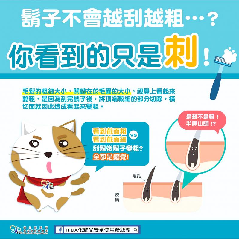 食藥署說明,毛髮的粗細大小,在於毛囊的大小,刮完鬍子後,視覺上看起來會變粗,是因為刮鬍子時,將頂端較細的部分切除,橫切面看起來就會比較粗,所以鬍子會越刮越粗,其實是視覺上產生的錯覺。