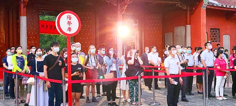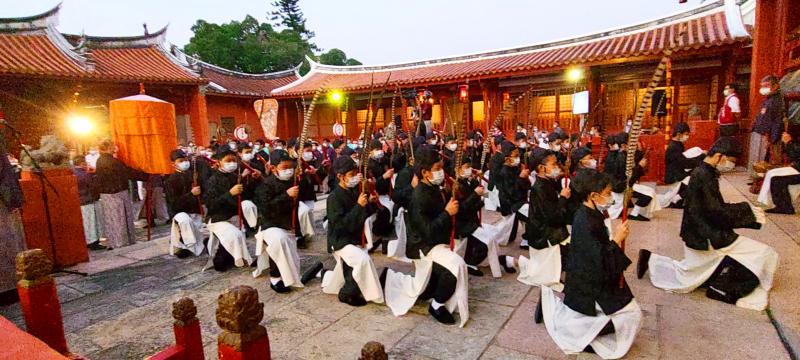 All of the participants were wearing masks to comply with pandemic prevention measures and, although the crowds were smaller than in previous years, a sizeable number of people came to observe the traditional rites. In addition to students from Tainan Municipal Jhongyi Elementary School, a group of Czech exchange students studying Taiwanese history at Tunghai University attended the ceremony wearing masks embossed with the national flags of Taiwan and the Czech Republic to experience a unique aspect of Taiwanese culture.