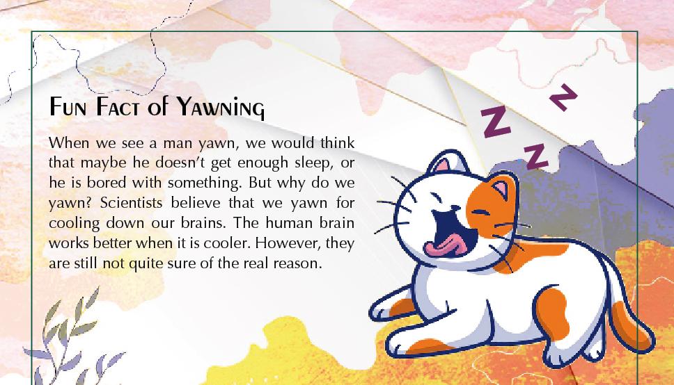 When we see a man yawn, we would think that maybe he doesn’t get enough sleep, or he is bored with something. But why do we yawn? Scientists believe that we yawn for cooling down our brains. The human brain works better when it is cooler. However, they are still not quite sure of the real reason.