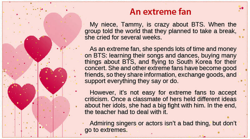 As an extreme fan, she spends lots of time and money on BTS: learning their songs and dances, buying many things about BTS, and flying to South Korea for their concert. She and other extreme fans have become good friends, so they share information, exchange goods, and support everything they say or do.
