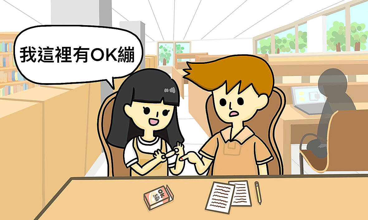 小實:哇!流血了!來!我這裡有「OK繃」,趕快貼起來。