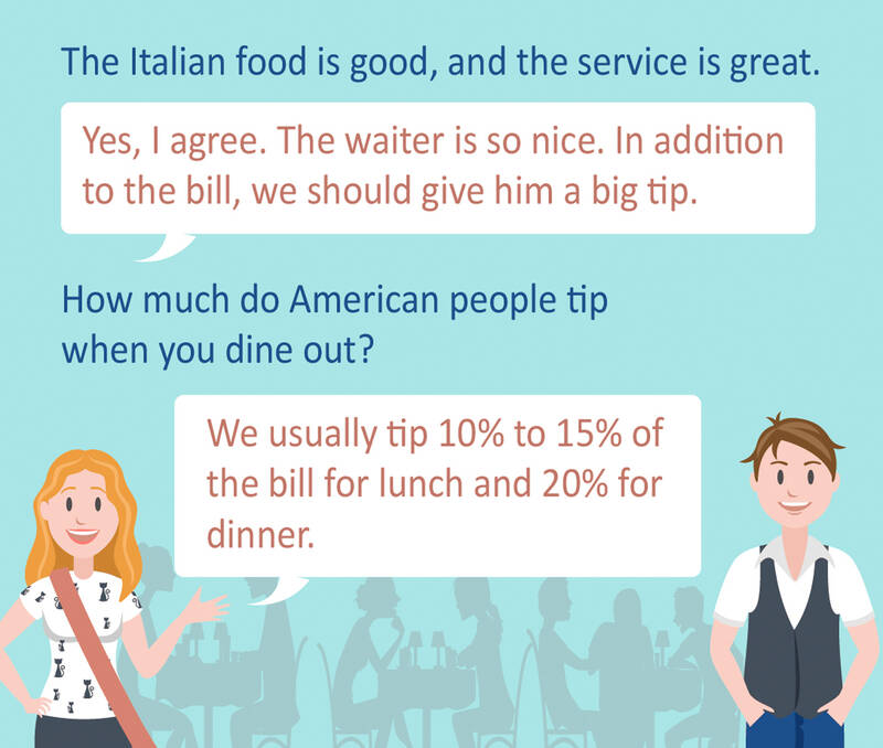American: Yes, I agree. The waiter is so nice. In addition to the bill, we should give him a big tip.